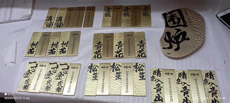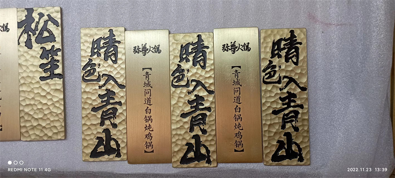黃銅鍛打牌制作中常用到的材質(zhì)有,黃銅、鋁板、紫銅等。